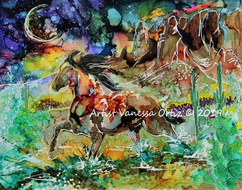 This mesmerizing alcohol ink painting by Vanessa Ortiz Zapata captures the beauty of a metaphysical horse in the desert, rendered in a range of vivid and bold colors. The use of alcohol inks creates a sense of depth and texture, with the hues blending and bleeding into one another to create a sense of movement and energy.